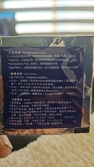 Instructions for use:This product is suitable for above zero degrees Celsius. Open the hood of the car, find the wiper, add a piece of wiper (if the glass is too dirty, it is recommended to add 2 pieces), wait for 5 minutes and then use it normally. A piece of conventional water can be exchanged with 4L of water. According to the normal volume of the liquid storage tanks, it is a piece of water, which can replace and be superior to traditional glass water!
