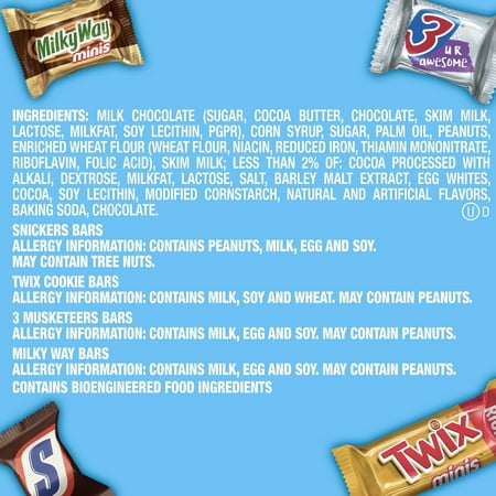 Enjoy this assortment of mini classic milk chocolate bars with BIG taste! Mars Mixed SNICKERS, TWIX, MILKY WAY & 3 MUSKETEERS Minis Variety Bag is perfect for all occasions. Ideal for party favors, movie nights, candy bowls, and piñatas, individually wrapped mini candy bars ensure lasting...