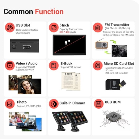Please read before using: The USB cable is NOT for charging, ONLY for connection with Computer. If you have issues with power on the GPS by the USB cable, please use the car charging adapter to charge the GPS for 10 minutes first. Product Description All different models have same functions,...