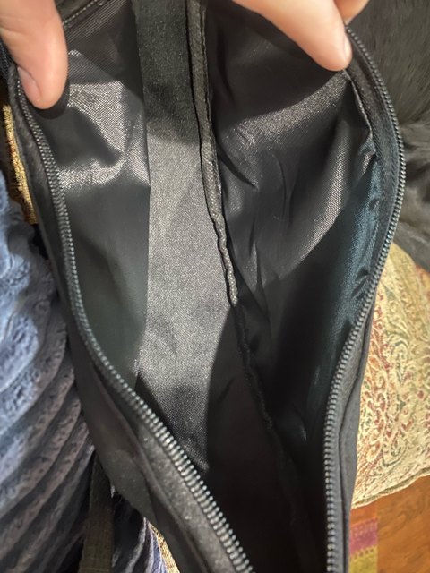 Looks great! Very roomy. No loose threads or chemical smell. No inside pockets.