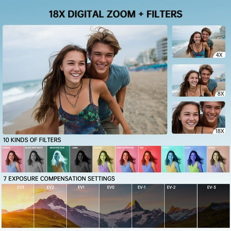 - MULTIFUNCTIONAL PHOTOGRAPHY CAMERA: The 4K digital video camera features a date stamp, exposure compensation (-3.0 to +3.0), video pause and playback, time-lapse, slow-motion, giving your videos a creative edge. Additional features like a fill light, Anti-shake, 3 continuous shooting, smile & face detection, beauty face, self-timer, and various filters encourage you to stretch your creative boundaries.